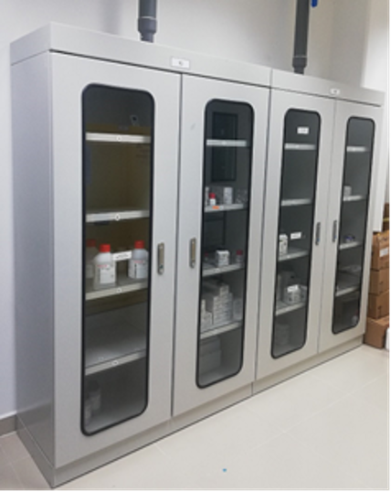 - Tủ chứa hóa chất có lọc than hoạt tính giúp hấp thu một phần lượng khí thoát ra trong quá trình lưu trữ.